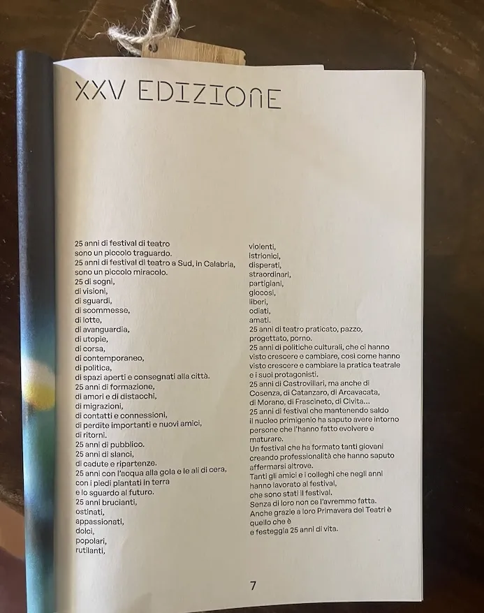 Un quarto di secolo non è solo una ricorrenza da segnare sul calendario: è la testimonianza viva di un percorso fatto di visioni artistiche, scelte coraggiose e sfide affrontate con lucidità e passione. Venticinque edizioni del festival Primavera dei Teatri a Castrovillari – cittadina dell’entroterra cosentino lontana dagli snodi ferroviari e dal turismo costiero – raccontano la forza di un progetto che ha saputo restare vitale, pur attraversando crisi economiche, trasformazioni sociali e culturali.