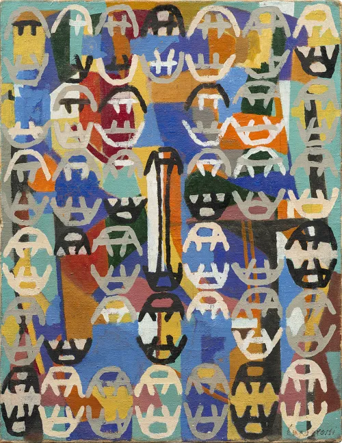 La mostra è, si potrebbe dire, tanto il racconto di come Capogrossi sia passato dalla maniera del Ritratto muliebre alle Superfici, quanto la dimostrazione di come, in filigrana, qualcosa del Ritratto muliebre rimanga ancora rintracciabile nelle Superfici. Lo stesso discorso vale per Burri: l’organizzazione spaziale della Festa dei morti (1945, Città di Castello, Fondazione Palazzo Albizzini Collezione Burri) ritorna, con analoghi accorgimenti compositivi, nel Sacco (1953, Città di Castello, Fondazione Palazzo Albizzini Collezione Burri). Qui, l’alternanza di materiali eterogenei, l’impiego di diversi tipi di juta, cuciture, campiture nere e innesti rossi costruiscono la superficie come un campo di tensioni formali, secondo logiche già adottate nei dipinti figurativi. È osservando questa accoppiata che lo spettatore si può accorgere di come Burri operi uno spostamento dal paradigma della rappresentazione a quello della presentazione: sostituisce il colore con la materia – usata in senso pittorico – e ne fa il veicolo di una nuova forma di astrazione. Si tratta di quella «irriducibile presenza», di cui parla il pittore, che non si può dire o raccontare, ma solo vedere e vivere.