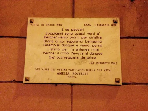 Sul Corriere della Sera del 12 febbraio 1996 c’è un articolo di Dino Martirano. Comincia così: “Alcuni vicini l’avevano vista aggirarsi sul ballatoio del vecchio palazzo di via del Corallo: qualcuno le aveva gridato di stare calma e di tornarsene nel suo appartamento. E lei, raccontano altri condomini, si era ritirata docilmente. Era rientrata e si era attaccata al telefono per parlare con Giacinta Del Gallo di Roccagiovine, l’amica che ha tentato invano di dissuaderla. Ma è mancato il tempo necessario perché quando la Del Gallo è salita al quinto piano non c’era più niente da fare. La porta di casa era spalancata e in cucina c’era una sedia appoggiata al davanzale della finestra. Il corpo della poetessa Amelia Rosselli era già in fondo alla chiostrina interna”. Figlia di Carlo Rosselli, teorico del Socialismo Liberale assassinato in Francia per volere di Mussolini, Amelia Rosselli abitava dal 1980 in via del Corallo, in una minuscola mansarda affacciata sui tetti che incorniciano piazza Navona. La targa è dirimpetto a una trattoria, nel punto in cui ogni sera si raccoglie una fila di avventori in attesa di un tavolo – coppie di russi impellicciati, americani fracassoni, spagnoli che cantano Nel blu dipinto di blu. Davanti a quella lapide risuona la chiusa de I fiori vengono in dono: “Il mondo è sottile e piano: / pochi elefanti vi girano, ottusi”. E si sentono scricchiolare i sampietrini di Roma.