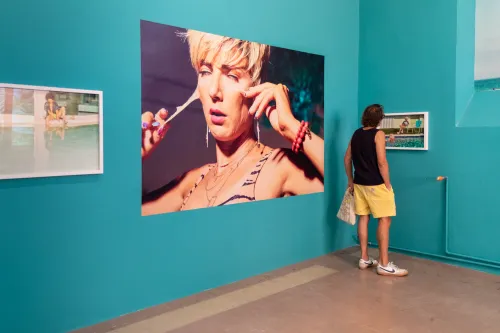 Dall’Église des Trinitaires, si fa un salto e si piomba in un grottesco silenzio di spazi aperti disabitati. Ci sono le cicale nei pochi scorci estivi delle fotografie di Todd Hido, l’impercettibile affondo dei fiocchi di neve sul parabrezza in quelli invernali, c’è il fischio del vento tra siepi e guardrail e il minuto ronzio di un lampione accostato a un acerbo parcheggio, ci sono i sussurri dettati all’orecchio di una bionda signora. Poi ancora, si cammina per qualche manciata di minuti tra le strade di Arles, sino all’Ancien Collège Mistral, e si scoprono fosforescenti e gelatinosi paesaggi che suonano di cantate neomelodiche, microfoni autotune e motivetti dance, sparati a tutto volume dalle casse a bordo piscina, grida di comitive e famiglie accalcate tra gli ombrelloni, sirene spiegate di una nave da crociera che irrompe in un porto, mentre affilate unghie di plastica rosa brillante picchiettano su un bicchiere di gin tonic. Sono le immagini di Kourtney Roy, fotografa e regista canadese di stanza a Parigi, in un lavoro dedicato alle vacanze di lusso.