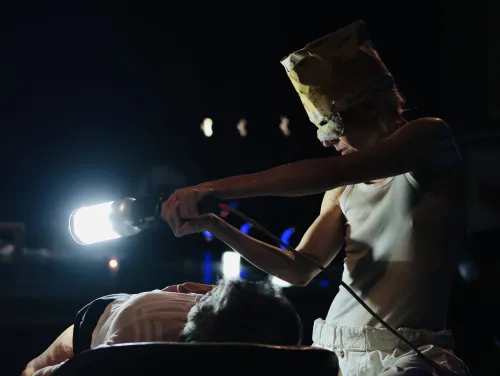 Nel centro della platea avvolta nel suo sudario di luogo morente, una lettiga di fattura orientale, di legno, come altre volte usata da Ronconi, su cui Gualtieri siede, ascolta, a volte è sdraiata come se lavorasse col sogno, altre volte prende la parola. Al suo fianco una figura bianca ed esile, nel corpo mobile e indecifrabile creatura oltre il femminile-maschile ma anche l’umano stesso, Silvia Calderoni. La quale, come già fu Pinocchio in Enigma, è creatura danzante di dinoccolata fluidità, di nuovo emblema del vivente in futura evoluzione, per una specie che deve essere “rifecondata”, scrollandosi di dosso i presupposti della specie medesima. Come sempre con Teatro Valdoca è tutto evocazione di un “enigma” in cui parola e gesto teatrale sono scioglimento e condivisione, non potere di un Mago dominatore. E sta nell’agitarsi allegro della figura incarnata da Calderoni, a volte contratta, le mani sulle orecchie, come vittima di bombe che sentiamo sibilare e risuonare angoscianti nello sciame elettronico dei suoni. Oppure quando con abbigliamento bianco, con un cappellino-maschera di carta, prende per mano la poeta e insieme corrono leggere. Calderoni sembra un Ariel di terra, che affianca in duetto Gualtieri (che però è un anti-Prospero). Intorno spesso sale un canto di una voce sospesa e avvolgente, che davvero incanta, ed è affidato a Sara Bertolucci, che sulle tonalità di soprano crea un’eco di pace possibile, un “lullaby” sacro in attesa di un risveglio.
