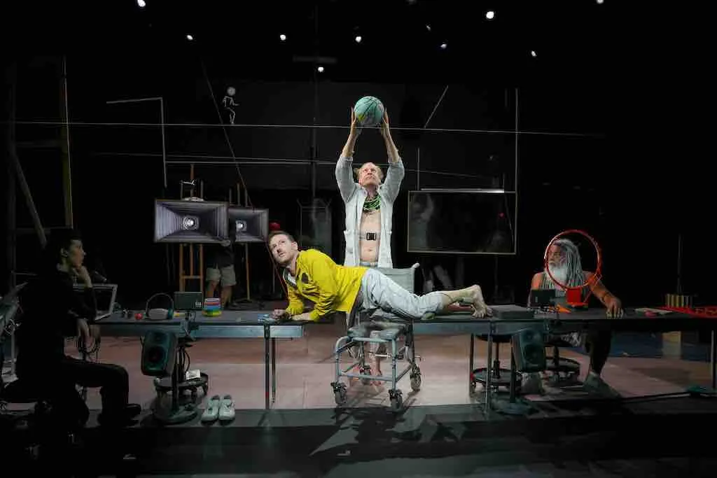 Fisico atletico enfatizzato da una canottiera alla “Un tram che si chiama desiderio”, salute di ferro, dieta e funzione sfinterico-digestiva supervigilate, abbigliamento casual, inclinazione alla disciplina refrigerante dello sport – quante palle, palline, palloni targati Spalding sul palcoscenico (un omaggio a Spanding Gray, membro fondatore della compagnia, morto suicida nel 2004?) – il ‘Presidente’ di Ari Fliakos e la sua esilarante, canora corte di ratti/alter ego/super io dalle voci angeliche, cavernose, virate da tecnodistorsioni controllate al millesimo, hanno ben poco a che vedere con la formalità metronomica dei personaggi in completo nero – un po’ FBI, un po’ Blues Brothers e molto Roy Cohn – della Sinfonia del 1988. E ci mancherebbe altro: sono passati trentasette anni, due misteriose emergenze sanitarie globali non domate e almeno nove ‘guerre’ conclamate. Nel frattempo la protesica mutazione antropologica prodotta dall’intelligenza artificiale si è tradotta in progressiva disidratazione della cosiddetta intelligenza naturale. La mirabile promessa tecnologica annunciata negli anni ottanta si è convertita in incubo e il futuro è evaporato.