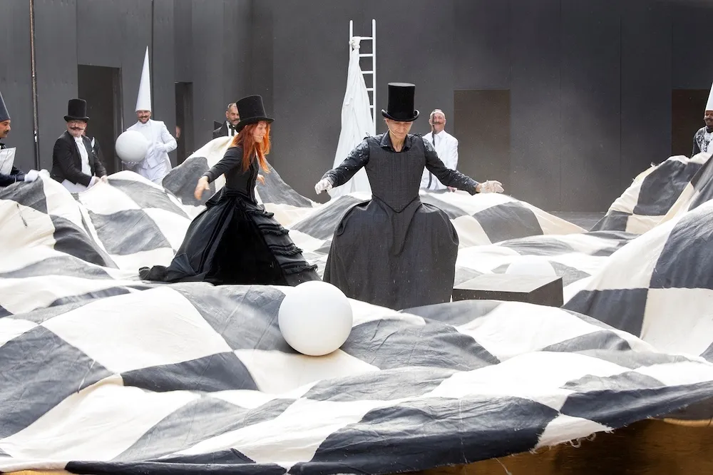 A lei, l’intraprendente eroina della fiaba, in crinolina e cilindro nero (Viola Ferro, presenza eterea, un’equilibrista tra vertiginosi filosofemi e scoppi di risa con cui costellare il dettato e i silenzi) spetta il compito di guidarci verso la seconda stazione del nostro pellegrinaggio: tra apparizioni di figure enigmatiche — i sensazionali costumi portano la firma di Emanuela Dall’Aglio — ci fermiamo adesso di fronte a una lunga parete di pannelli neri, oltre i quali immaginiamo il poligono del campo incorniciato dalle due ali del carcere. Ma la nostra vista è ancora accecata, sembra ricordarci Cenerentola: uno sforzo ulteriore, dell’animo più che della mente, è la conditio sine qua non per continuare il viaggio. Adesso è il bianco a ricoprire le mani di Punzo, mani con cui disegnare, come in una grotta primordiale, vie lattee sulla superficie oscura: strade altre, percorsi di luce eterodossa sopra il nero. È un’ermeneutica del bianco e del buio ad attraversare la drammaturgia, una filosofia dei colori assoluti che qui, nell’istituzione totale per eccellenza, risuona di significati ben più che estetici. Mentre i pannelli si aprono sulla vastità del cortile, Paul Cocian — storico attore e collaboratore della compagnia, in scena negli stessi giorni con il primo studio di Fame, monologo che per lui Punzo ha scritto e diretto a partire dall’omonimo romanzo di Knut Hamsun — ci avverte così che “avanzare in territori sconosciuti è per me come entrare nella mia vita”. Ed è l’universo a spalancarsi agli occhi di questa comunità di spettatori: l’allestimento scenico, a cura di Alessandro Marzetti e dello stesso Punzo, sembra poterci mostrare per la prima volta uno spazio in realtà notissimo, dilatandolo in una fuga prospettica di quinte nere, porte e archi, estendendolo in una longitudine di geometrie metafisiche.