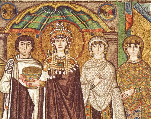 Qual è il colore del potere? La porpora. Nella chiesa di San Vitale a Ravenna il mosaico che raffigura l’imperatore Giustiniano I è composto di tessere di un materiale inorganico purpureo, così anche l’imperatrice Teodora: porpora bordato d’oro. Si tratta della porpora di Tiro il cui segreto fu custodito dai Fenici, che a partire da millecinquecento anni prima della nascita di Cristo accumularono enormi ricchezze tingendo le stoffe indossate da nobili e imperatori di Roma. Il porpora, colore magico, ha confini imprecisati: è rosso, scarlatto, violetto, turchino o rosa-violaceo.