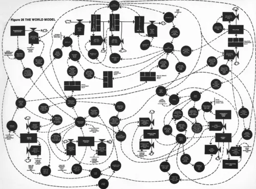 In copertina, Modello del mondo, 1972, Libro a stampa, In Donella H. Meadows, Dennis L. Meadows, Jørgen Randers, William Behrens III, The Limits to Growth. A Report for the Club of Rome’s Project on the Predicament of Mankind (New York: Potomac Associates – Universe Books, 1972), Collezione privata, Courtesy of the authors via System Dynamics Society.