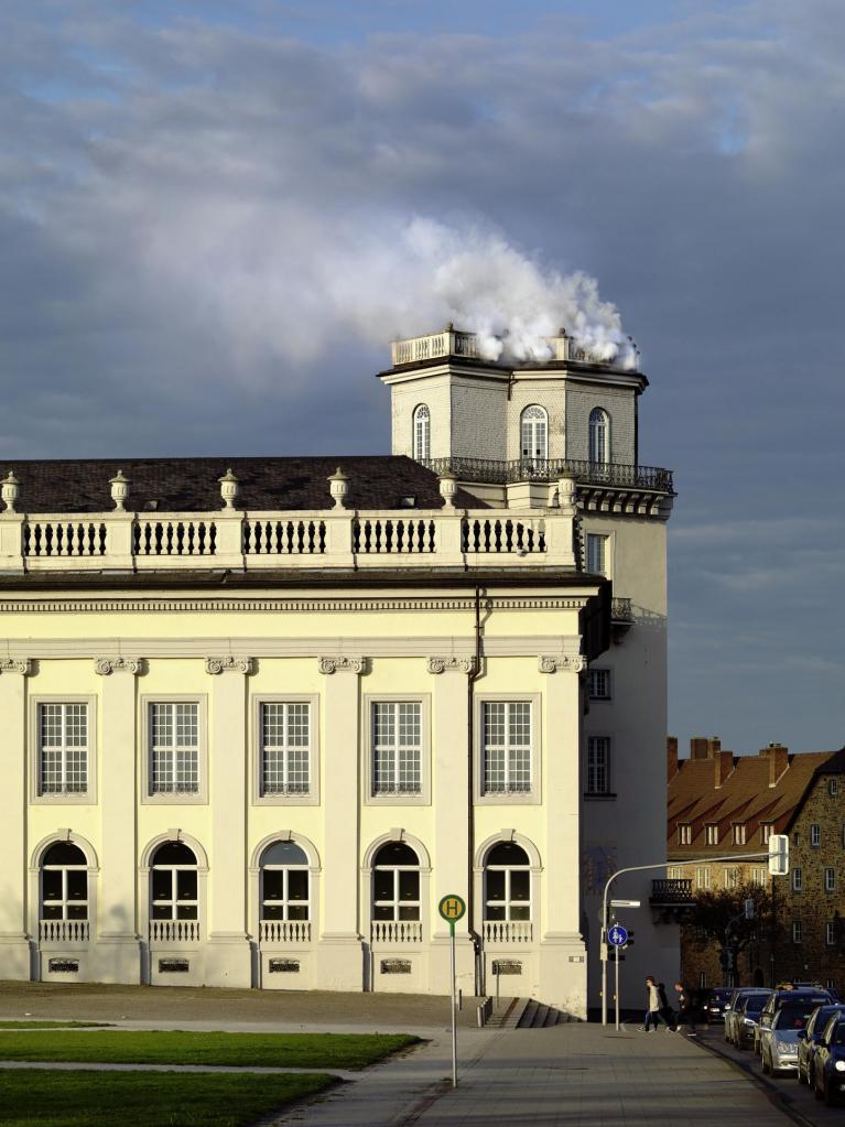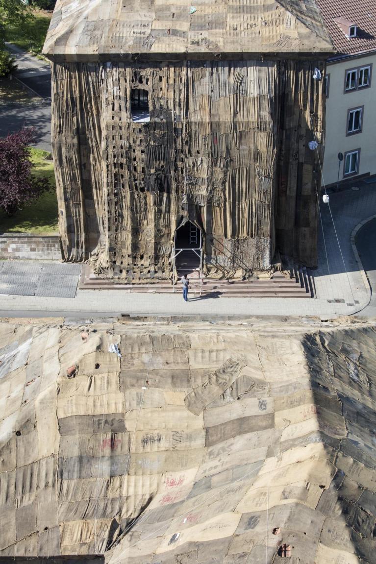 Il primo, un “impacchettamento” del Torwache (che conserva il monumento alle vittime della Shoah di Auschwitz-Birkenau) con sacchi di iuta (realizzati in Asia e utilizzati in Ghana per imballare carbone, caffè, riso, fagioli e cacao, per il loro commercio), rottami, teloni e cuoio degli interni dello “sfolgorante” treno Henschel, fiore all’occhiello del Reich che collegava Berlino con Dresda, utilizzati dall’artista ghanese per il suo site-specific. Una colonna di fumo dal Zwehrenturm, la seconda.