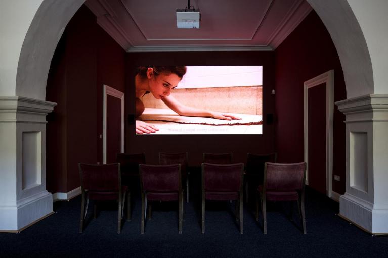 The Dust Channel è il capitolo finale che Roee Rosen (Rehovot, 1963) ha dedicato al personaggio di fantasia, il migrante russo Maxim Komar-Myshkin, figlio di Efim Poplavky (1978-2011). Esposto al Palais Bellevue, il delirante e ipnotico video mette in scena un’operetta cantata in russo. Traslata nell’ambiente domestico di una famiglia israeliana con la fobia della polvere e i metodi bizzarri utilizzati per eliminarla. Ma la polvere in realtà è sabbia (in ebraico Holot), metaforicamente adottata per esprimere l’attuale xenofobia (il centro di detenzione dei rifugiati politici, situato nel deserto israeliano, è, infatti, denominato Holot). Nascosta, e neanche ben segnalata, è la suggestiva e articolata installazione Good Luck di Ben Russell (Springfield-Massachusetts, 1976).