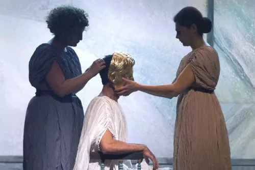 Perché presentare blocchi così monolitici? E soprattutto, perché offrire allo spettatore un’indigesta porzione di Virgilio? La riposta è immediata, nella sua complessità: perché quello che siamo invitati ad ascoltare non è più semplicemente Virgilio, ma Virgilio deformato dalla lente di Anagoor. Le parole e i canti che abbiamo udito, le immagini che abbiamo osservato hanno modificato in poche manciate di minuti la nostra percezione dell’Eneide, e non importa quanto a fondo conosciamo il capolavoro virgiliano. Beninteso, niente che non accada in ogni (riuscita) rappresentazione del classico. Ma qui la riproposizione sic et simpliciter del testo originale scopre le carte e rivela un trucco che in genere resta celato: sta a noi utilizzare gli strumenti emozionali e interpretativi che gli autori ci hanno lasciato poco prima, e trarne le conclusioni.