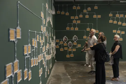 Berti intraprende a tutti gli effetti una ricerca di natura storica, trasportando questo flusso di lavoro e di scoperta all’interno dello spazio dell’arte: la grande installazione (“Discendenza di Rosa, Francisco e Liberata Boggiano”, 2018-25), visibile presso la galleria Guido Costa Projects a Torino fino al 10 ottobre per la mostra “Eredi Boggiano”, è uno dei grandi alberi genealogici che l’artista è riuscito a comporre finora, diramato sulle grandi pareti della galleria.