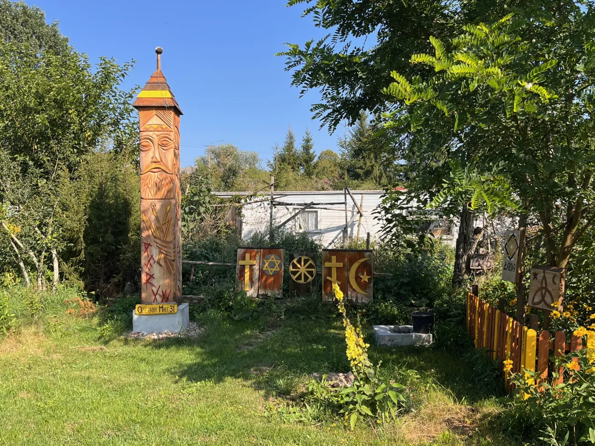 Al cospetto di Perun, in un contesto piuttosto solenne, sullo sfondo stanno quattro inequivocabili pannelli lignei che richiamano alle religioni, come ci spiega in qualche modo l’autore di quelle sculture. Infatti sul primo pannello vi è una croce cristiana, e proseguendo da sinistra a destra vi sono una stella di Davide ebraica, un kolovrat che fa parte sempre della mitologia slavica che è una sorta di simbolo del sole (un po’ come la svastica, ma in questo contesto privo di un’associazione con l’estrema destra), una croce ortodossa con le tre traversine di provenienza bizantina e una mezzaluna con stella che chiaramente rappresenta l’Islam. Sentire queste parole di Miroslav sulle religioni in un luogo di confine come questo, vedere i simboli dell’ebraismo vicino a quelli del credo musulmano, nei giorni della feroce distruzione di Gaza in qualche modo mi rende un pelo più ottimista per la direzione dove sta andando l’umanità. Interrogato su come si sente a vivere così vicino alla barriera e alla Bielorussia, Miroslav dice di sentirsi tranquillo qui nel bel mezzo della natura e che l’unica cosa che lo infastidisce è il ronzio notturno dei droni che disturba il suo sonno. Stiamo ancora un po’a parlare con Miroslav, ma il tempo stringe: dobbiamo tornare a Białystok. Risaliamo allora in macchina e io ripenso a che bella cosa sia quella che ha fatto Miroslav come singolo cittadino, in tutta la sua innocenza e la sua provincialità, ma con buone intenzioni: un monumento al dialogo tra le culture e le religioni. Il suo semplice messaggio mi ha toccato nel profondo.