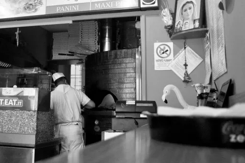 Lui è un tipo tracagnotto di quelli che è meglio non fare incazzare, possiede nei modi e nello sguardo quella gentilezza tipica del pugile che è andato in pensione, cosciente della sua pericolosità latente. Ha la faccia simpatica, dà l’idea di essere un gran lavoratore. È cristiano cattolico, entrando c’è in bella mostra sulla destra, su di una mensola in linea col registratore di cassa, l’immagine della Madonna di Lourdes e subito lì a fianco il Sacro Cuore di Gesù. Ordino una pizza, mi siedo e rubo lo scatto.