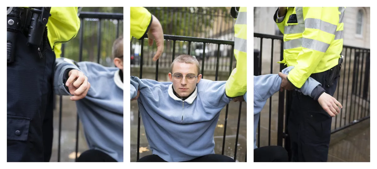 L’unico vero grido di rivolta e speranza lo lancia Andy Sewell (1978) con Slowly and Then All at Once. La crisi climatica si muove su questa soglia, un tempo fatto di lentezza apparente e fratture improvvise, di fenomeni quasi impercettibili che, nel momento in cui si riconoscono, sono già troppo vasti per essere arginati. Nella proiezione, che infonde vita e anima le fotografie, si vedono manifestazioni di piazza, riunioni e vertici istituzionali, cieli stellati, boschi rigogliosi. Spesso articolate in dittici e trittici, le immagini appaiono disgiunte ma fluide, montate come se il tempo potesse piegarsi, non tanto a costruire un racconto lineare, quanto a evocare uno stato mentale. Il dinamismo dei manifestanti si oppone all’immobilismo dei politici, i loro corpi, afferrati dai poliziotti o stesi a terra, spesso in posizione orizzontale, sono in contrasto con la verticalità di un potere anonimo e asettico. Il potere non concede nulla senza una richiesta. Non l’ha mai fatto e mai lo farà. Scopri fino a che punto un popolo è disposto a sottomettersi, e avrai scoperto l’esatta quantità di ingiustizia e torto che gli verranno imposti, si legge a un certo punto della proiezione. Un ragno, sospeso nel vuoto, si staglia nel cielo a ricordare la ragnatela delle immagini che scorrono. Una donna con gli occhi chiusi, assorta nei suoi pensieri, sta forse sognando un futuro diverso, e dopo pochi secondi, una vegetazione verdeggiante si fa largo sugli schermi.