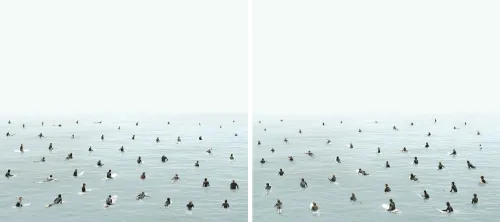 FJ: The Surfers come opera nasce addirittura dopo la fine del progetto WEST, infatti io non considero The Surfers una vera opera di WEST, anche per un motivo banale, che tutte le fotografie di WEST, per quanto strane, sono “vere fotografie”, il dittico The Surfers è l'unica falsa perché è costruita. Io e Sara Gentile, la mia compagna, abbiamo fotografato l’Oceano Pacifico all'alba, in modo che fosse placido, quindi non un mare da surfisti perché non ci sono onde, e poi nei giorni successivi con dei teleobiettivi abbiamo fotografato 80 surfers, poi li abbiamo montati in questa specie di parlamento, di spazio simbolico e corale.