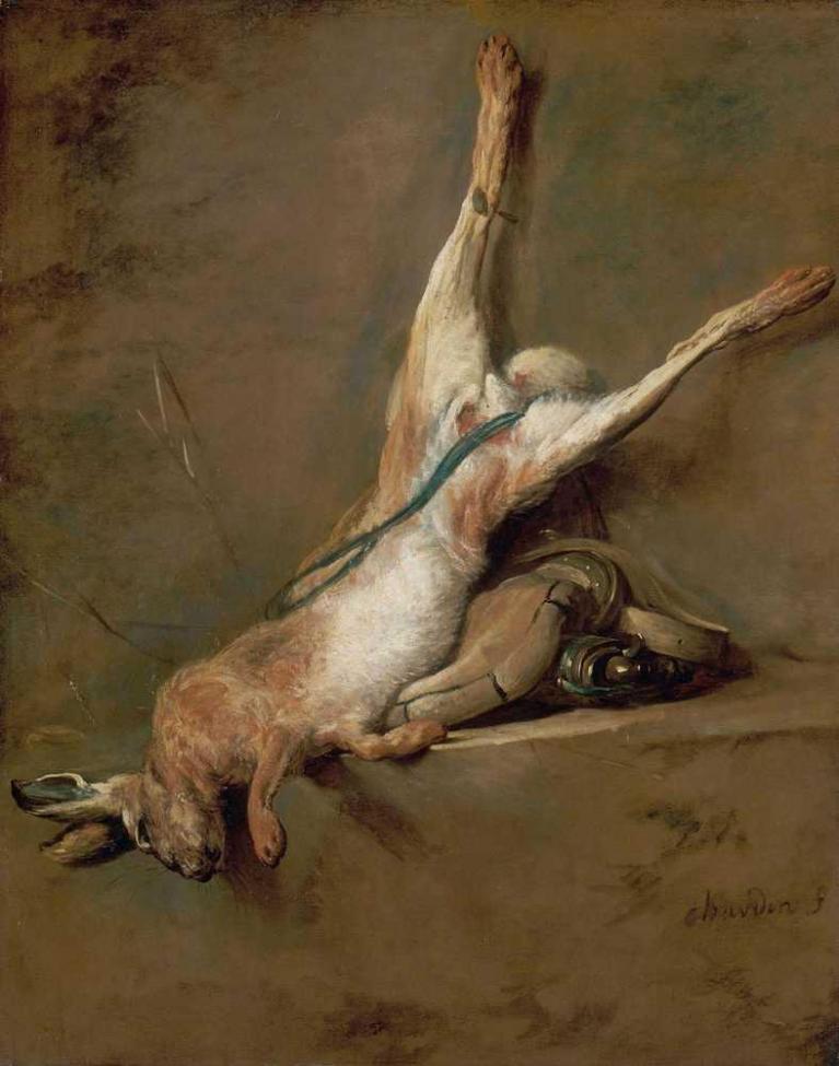 Chardin, Lepre morta con sacca per polvere da sparo e carniere.