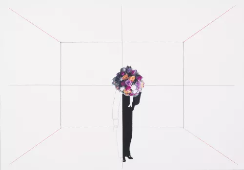 Di quest’ultima ansia si fa in questa mostra ammissione ed esorcismo. Lo si osserva in quel circospetto congedo che è L’artista ringrazia (2022): un collage in cui l’artista ringrazia il pubblico nascondendosi il volto, cioè quell’identità che lo rende individuo unico, con un mazzo di fiori. La tentazione di paragonare questa immagine al pupazzo di cera che Maurizio Cattelan ha installato al Cimitero monumentale di Milano negli stessi mesi è troppo forte: lì, Cattelan propone il suo corpo impiccato, con in mano un funereo mazzo di fiori; qui, Paolini officia la cerimonia in cui l’autore, quasi nei panni di un impacciato spasimante, non vuole mostrarsi nemmeno quando giunge finalmente il momento, sul palcoscenico, di ricevere il riconoscimento del suo pubblico.