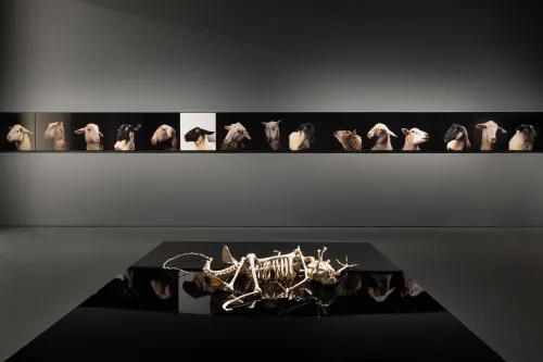 Gli artisti convocati in questo consesso epocale, provenienti da continenti e contesti diversi, sono accomunati da una precisa e lucida tensione emotiva e intellettuale, seppure espressa con varie sensibilità e con mezzi diversi, verso la vita animale. Introducono la mostra un testo e alcuni pannelli dell’artista grafica e attivista animalista Sue Coe. Se gli animali credessero in Dio, identificherebbero Satana negli umani, scrive Coe, per le sofferenze che noi umani sappiamo infliggere loro. Lo sguardo degli animali su di noi e il nostro su di loro si riflettono di continuo in tutte le opere: fotografie, installazioni, sculture, disegni, dipinti, video, suoni. Una parte interessante sono proprio i rumori e i suoni, secondo il campo emergente della zoomusicologia, presente in mostra con una serie di artisti selezionati da Joanna Zielinska, senior curator del Museum of Contemporary Art di Anversa.