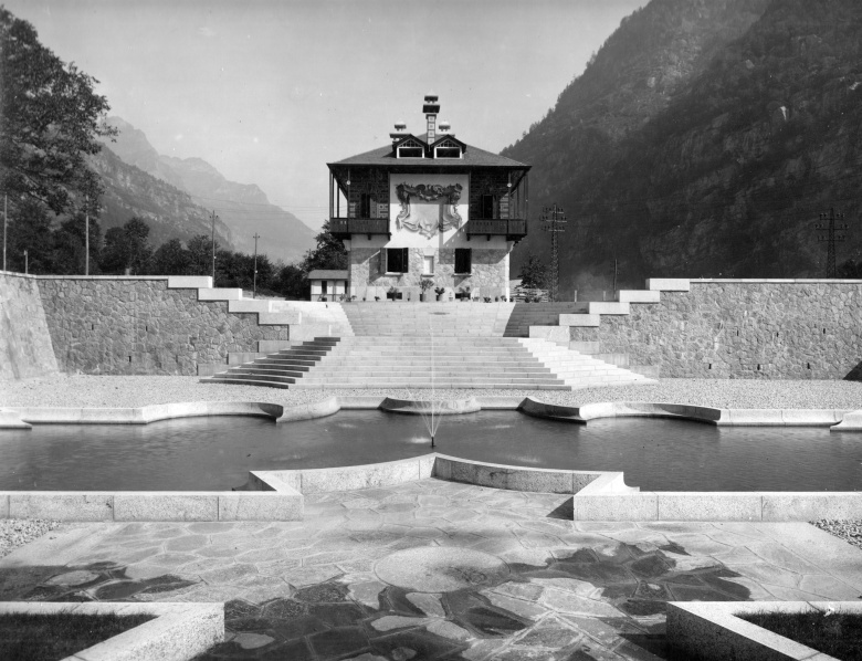 L’altro elemento significativo del giardino di Verampio è l’acqua. Si sa a che punto nei magnifici progetti barocchi di Le Nôtre & co. l’acqua zampilli ovunque vivificando gli scenari formali e come il libero gioco del getto d’acqua si opponga al freddo linguaggio delle geometrie perfette. Qui, nel bel mezzo delle Alpi, l’acqua è ovviamente origine, fonte assoluta di quell’energia elettrica invisibile e celebrata. Approfittando della logica del supplemento, dell’esposizione (tecnicamente) inutile di un elemento altrimenti quasi astratto, la fontana centrale mette in scena l’acqua, proprio quella materia che in una centrale elettrica resta di solito nascosta. L’audace operazione di marketing estetico orchestrata dal Portaluppi (mentre la centrale, in una remota località alpina, si sottraeva alla vista, le pubblicazioni dell’architetto – specie i volumi Aedilitia I e Aedilitia II – utilizzavano la riproducibilità iconica contemporanea per iscrivere il progetto nella memoria culturale) parla quindi di tante cose: del potere del nuovo principe dell’industria, del controllo totale del territorio (vedi il linguaggio aggressivo delle torrette e bifore), dell’idea di dono generoso di energia alla regione/ nazione, nonché della trasformazione di un atto di annessione non privo di cinismo (travestito da semplice turista, Conti aveva perlustrato le valli alla ricerca dei salti più redditizi) in un gigantesco intervento non del tutto privo di teatralità. Come Versailles, che ai tempi di Luigi XIV era ben lungi dall’essere una Arcadia, questo primo piccolo centro assoluto del potentato elettrico non è quindi una semplice bizzarria, bensì il palcoscenico architettonico-paesaggistico di una strategia di controllo della natura e degli esseri umani.
