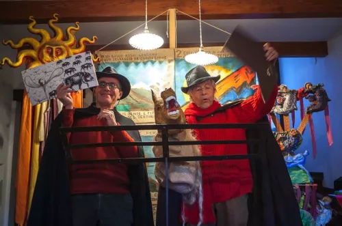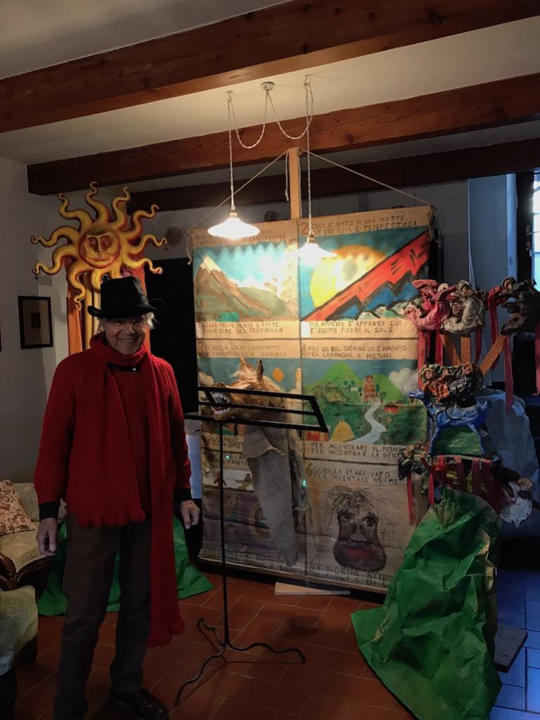 27 dicembre 2016. Siamo nella casa dei Notari, quella che fu abitata da Sveno, muratore anche lui come il padre e poeta nel tempo segreto, “murator sul foglio chino” a inventare ottave, come gli antichi poeti degli epici cantari. Siamo a Busana, nell’alto Appennino Reggiano, per gli auguri per l’anno nuovo. Siamo arrivati con un sole di cartapesta drappeggiato di stoffe colorate, con il vecchio cantastorie del Gorilla Quadrumàno, che nessuno ha mai domato né con baston né con la mano, il re delle bestie che, dopo aver salvato una corte, è tornato a regnare tra le fiere in mezzo al bosco. Indossiamo, Giuliano Scabia e io, due mantelli e due cappelli; abbiamo un cavallo piccolo da mettere sul cammino, di cartapesta colorata, e uno più grande da braccio. E il testo del Canto della vita indistruttibile.