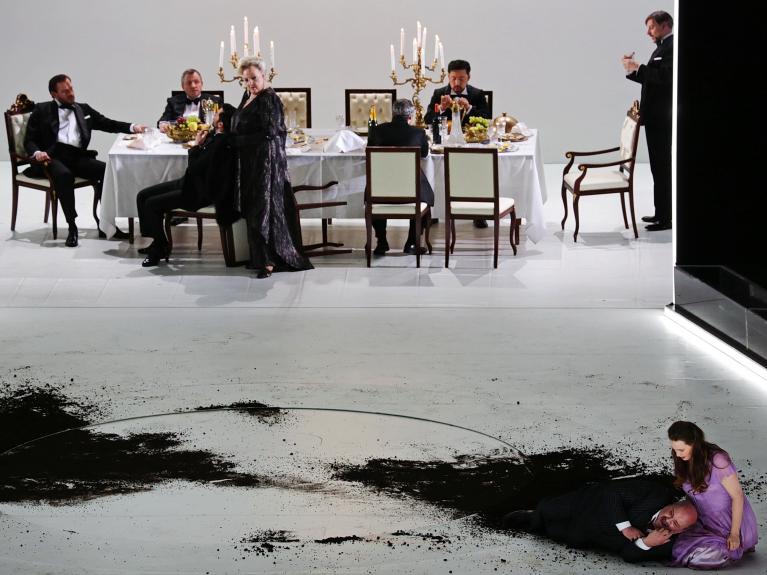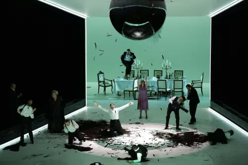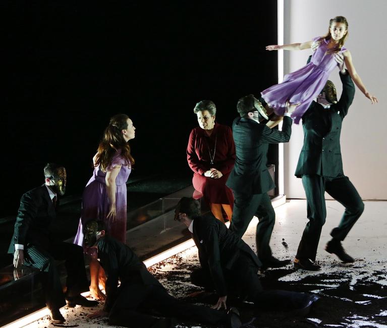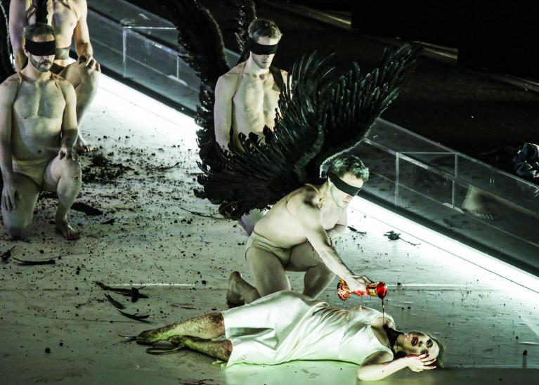 Cinque angeli della morte con grandi ali nere celebrano riti letali muniti di calici colmi di sangue, Erodiade sembra una matrona tedesca dell’età guglielmina, Erode è abbigliato con un gessato doppiopetto che potrebbe essere stato prelevato dal guardaroba di Scarface (e come lui la pattuglia di “doppi” con cui Salome intreccia la Danza dei Sette Veli, in apparenza finendo per subire violenza). La luna, protagonista spesso invocata del dramma, è una sfera nera che scende dal soffitto. La testa mozzata di Jochanaan ascende al cielo in un enorme ostensorio circonfuso di raggi luminosi, il suo sangue gocciola dall’alto e la perversa fanciulla/povera vittima quasi se ne abbevera mentre delira sulle labbra rosse del profeta. E prima di pagare con la vita, cerca di ammazzare anche Erodiade, come forse aveva già fatto da bambina con il padre, secondo la breve scena che lo mostra senza vita sullo sfondo.