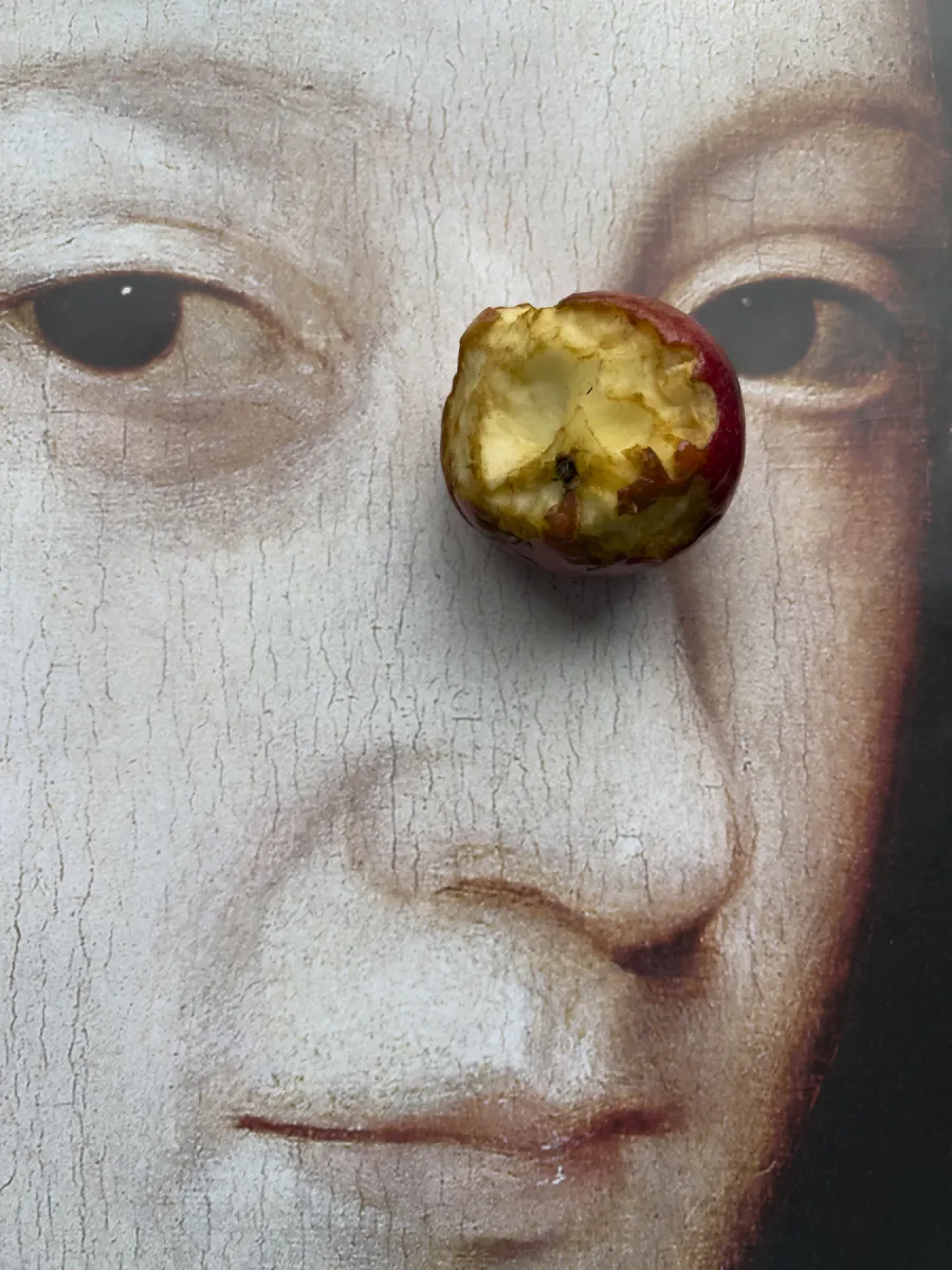 La lumaca che scivola lentamente su un piatto, avvicinandosi a una pesca (Leg, snails and peaches No.43, Londra 2017), lascia dietro di sé una scia sulla superficie candida, una metafora dell’impossibilità di raggiungere la perfezione del frutto e, allo stesso tempo, della fotografia come traccia lasciata dallo scorrere del tempo. Allo stesso modo, la mela morsicata, appoggiata sopra la riproduzione di un dipinto raffigurante il volto di una donna non più giovane, invita a riflettere sull’imperfezione e sulla vulnerabilità della bellezza.
