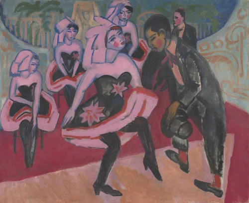 Qui abbiamo in chiave fantasiosa, appunto, un giovane nero che duetta con una ballerina in lunghe calze nere e scarpe e punta, abito scollato a fiorelloni, braccia nude e un bizzarro cappellino a falde bianche, tra l’olandese, il mormone e il circense. Sullo sfondo altre tre danzatrici, un secondo uomo in nero, e i colori stupendi tipici di Kirchner, ispiratore del gruppo espressionista Brücke di Dresda con colleghi del calibro di Erich Heckel, Otto Mueller, Emil Nolde e Max Pechstein. La scena ritratta, pur nella sua originalità – s’è detto del sottofondo scherzoso o satirico – rientra pienamente nella tematica della nightlife metropolitana che il grande artista affronterà negli anni a seguire nelle più diverse tecniche, dall’olio su tela al disegno alla xilografia.
