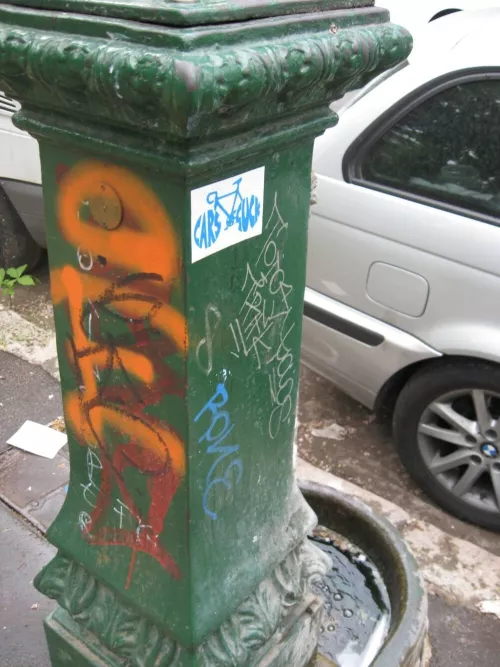 È vecchia, color verde polvere, un po’ scrostata, sul fianco ha un quadrato di carta bianca. Un appello per un gatto che non si trova più, per una casa? O in favore dell’acqua pubblica…