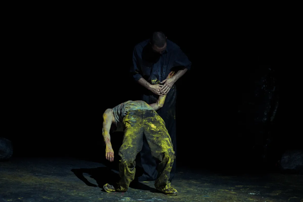 Progetto ambizioso che sottende una autoriflessione probabilmente. Chroniques, diretto da Carrizo in co-realizzazione con Raphaëlle Latini che firma anche il paesaggio sonoro, segna un passaggio oggettivo, dato che è la prima volta che è in scena un nuovo gruppo di danzatori-creatori: Simon Bus, Seungwoo Park, Charlie Skuy, Boston Gallacher e Balder Hansen. La loro prestazione è buona, con alcuni picchi, ma nel complesso non si vedono le invenzioni figurali dei corpi che contraddistinguono i lavori di Peeping Tom. È anche la creazione coreografica più semplice, a tratti monotona. È un mondo al lavoro, sono corpi nel passaggio all’Antropocene, e all’età della pietra e del ferro, con i monaci che maneggiano caraffe, martelli, scalpellano, creano sostanze alchemiche. Umanità nella trasformazione della materia, senza dimensione narrativa: in Chroniques dominano frammenti, lampi, presenze, visioni. Dentro un tempo che – nel balenio che dona le conquiste contemporanee della fisica quantistica – è solo spazio di trasformazione e non una successione lineare, in senso anti-storico, fatto di sovrapposizioni di metonimie che come razzi fanno comparire segnali di allusione a fondazione di imperi, conquiste coloniali, sviluppo della civiltà industriale. Tutto in una motilità senza requie, con tratti di giocosità: buffi rapporti con il mondo petroso che in realtà è gomma, con effetto Kindergarten. Una vena infantile anche nell’entrata in scena di guerrieri-nani conquistadores che usano i copricapi tondi dei monaci come grandi scudi da cui sporgono solo piedi e teste. Così come comico è il “salary-man” in abito standard che scopre la violenza.