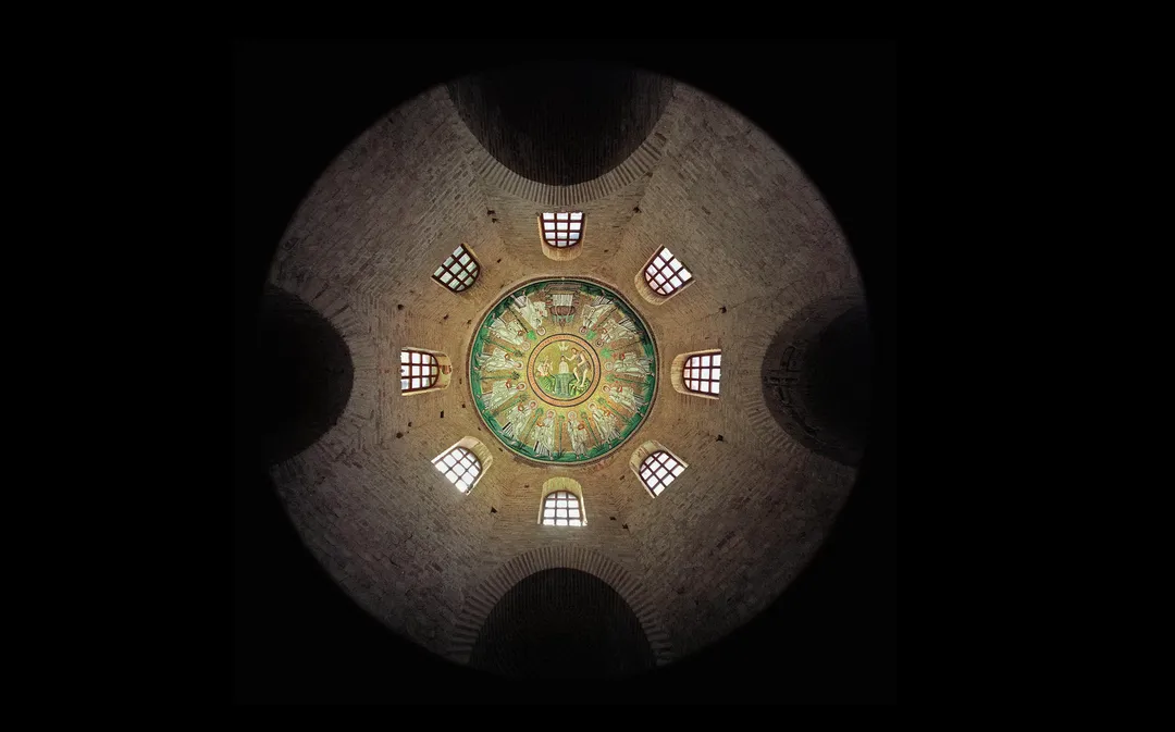 La Ravenna del quinto secolo rappresenta perciò un punto di partenza da studiare con grande attenzione. Esattamente un millennio prima del Mantegna della Camera degli sposi, il Battistero Neoniano installa al centro esatto della cupola un “occhio” che assorbe tutto. Lassù, l’occhio-oculus guarda le persone che si trovano in basso, con la specificità che attraverso il rito del battesimo questi ultimi possono entrare in relazione con Gesù.