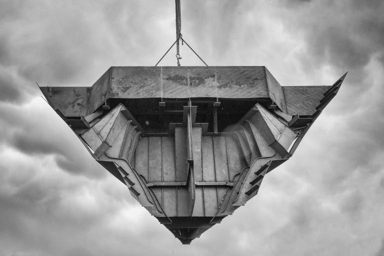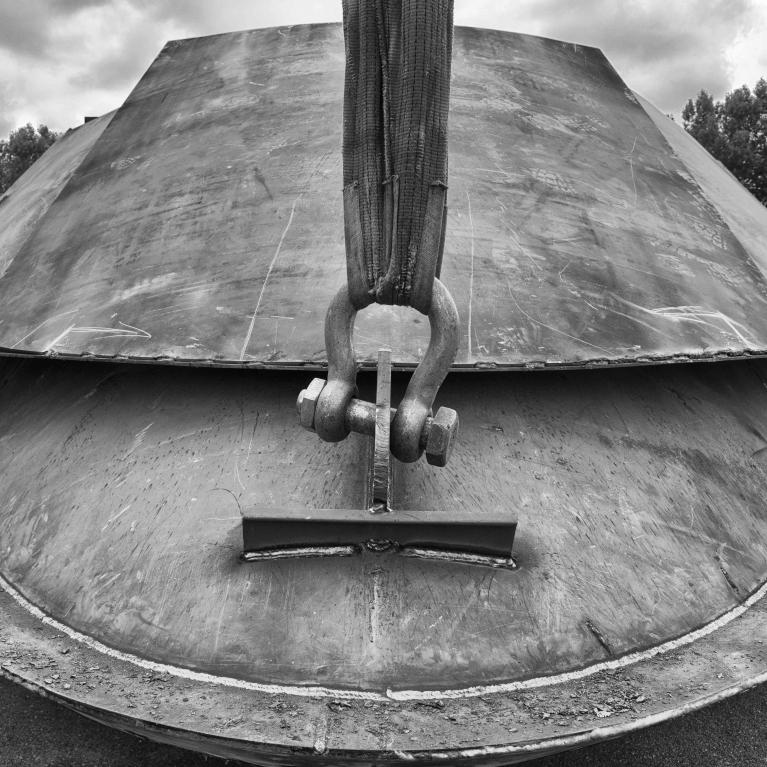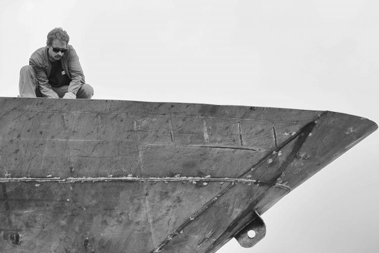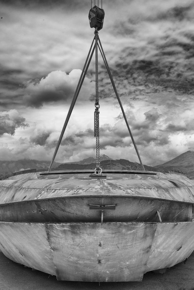 La drammaticità implicita nel suo sguardo si coglie perfettamente nel momento in cui lo scafo, non ancora leggibile come tale, viene issato mediante una gru subito dopo lo scatenarsi di un temporale. Le nuvole accentuano la forza caotica del momento. La loro forma imprendibile e cangiante si oppone alla forma definita e tozza dell’oggetto. Ma è il minuscolo uomo che dà il senso delle proporzioni dell’azione: alza la mano, come per indicare la direzione in cui spostare il grande sospeso. Appare piccolissimo sul piazzale del cantiere. Sopra di lui, immenso, si svolge il conflitto di aria e nuvole; sul piazzale la pioggia ha lasciato la propria traccia nelle pozze sparse. Il braccio della gru partisce così lo spazio dell’immagine come se il segno verticale fosse un asse del mondo, che si protende verso il cielo senza tuttavia raggiungerlo. Lavoro di formiche che manovrano oggetti immensi, li issano e li modificano con le proprie mani. Tutto è a misura d’uomo e tutto, per necessità, lo trascende.