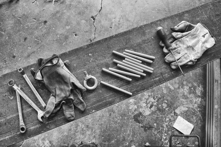 C’è qualcosa di drammatico in questa scelta di toni, non di spaventoso, piuttosto di drammaticamente titanico. Gli uomini si misurano con la materia in una lotta che è volta a dominarla, a piegarla, a dirigerla. Sono azioni compiute per ottenere dal metallo qualcosa di predefinito, per far combaciare le singole parti secondo la volontà del progetto. Lo sguardo del fotografo si fa teatrale, evidenzia gli spazi e la disposizione, i gesti e le posture. Si sofferma sui dettagli come nello scatto che ritrae guanti, attrezzi, carpenteria.