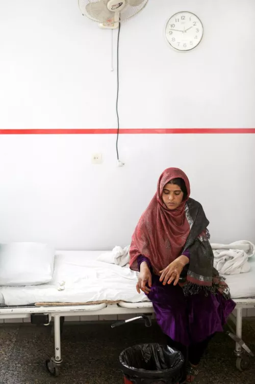 ©Duley, Kabul. Una donna con le mani ferite da un colpo di mortaio caduto nel suo giardino mentre stava facendo il bucato.