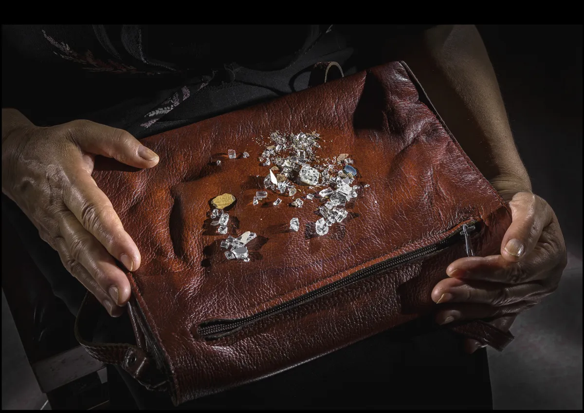 Sono come piccole scene teatrali illuminate dal fotografo, lampi di chiaro e di luce che si imprimono nella memoria digitale della macchina fotografica e restano grazie all’immagine stessa davanti a noi come un memento, come un ricordo e una vivida testimonianza. Il punctum di questa immagine sono le mani della donna: una, la sinistra, trattiene la borsa di piatto per impedire che quei vetri cadano per terra, l’altra, la destra, si posa con delicatezza sulla borsa stessa. Le mani sono tutto quello che scorgiamo del suo corpo. Nel resto del libro si vedono solo cose, oggetti, materie, lamiere contorte, ammassi ferrosi, fori di proiettile arrugginiti, parabrezza perforati, concrezioni indecifrabili – le macchine e gli autoveicoli, del resto, occupano la maggioranza nei 20 scatti di Mantovani. Che cosa è una borsa o borsetta per una donna? Un oggetto abituale e indispensabile. Un tempo nessuna usciva di casa senza la propria borsetta: per fare la spesa, per fare un viaggio, per andare a trovare qualcuno. La parola “borsa” è di origine greca: byrsa, che significa “pelle”. Si è diffusa nel Medioevo per indicare il sacco di cuoio femminile e maschile in cui si tenevano i propri oggetti personali, e prima di tutto il denaro. Niente è più individuale e privato di una borsetta.