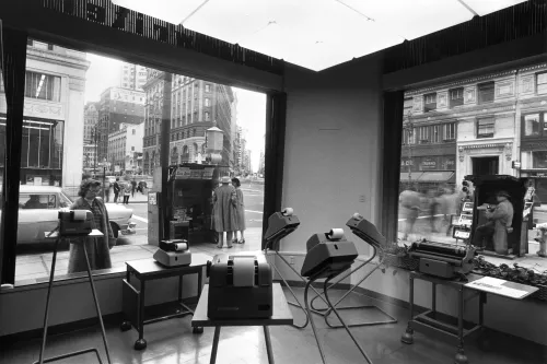 Wayne Miller, Negozio Olivetti a San Francisco, (L. Lionni e arch. G. Cavaglieri, 1953), vintage gelatina bromuro su barite, 1958, Fototeca, Fondo foto Lodovichi negozi e showroom Olivetti, fasc. 45, ©️ Wayne Miller / Magnum Photos