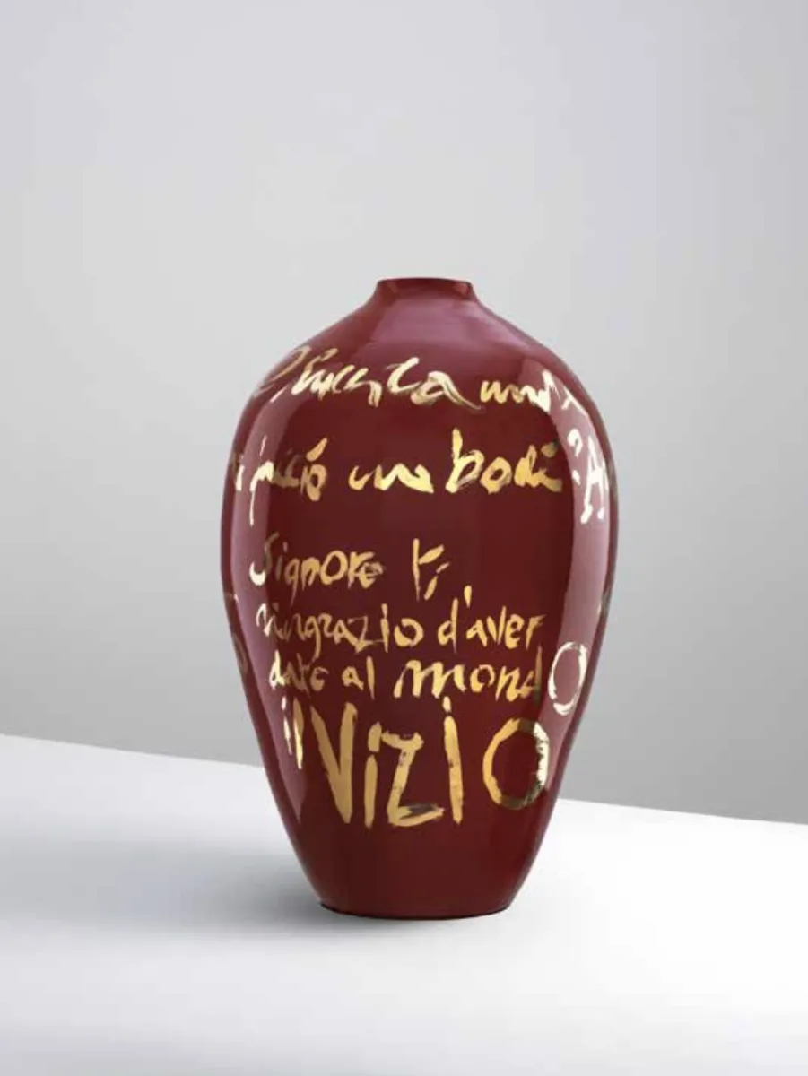 In un altro vaso le lettere sono in corsivo e non formano una sola parola dal senso molteplice, ma frasi di senso compiuto. Per leggerle a volte è necessario muoversi attorno al vaso, accompagnandone la circolarità delle forme. Si leggono frasi brevi, quasi aforismi o massime “immorali”, che fanno il verso all’arte impettita e seriosa (“Signore ti ringrazio d’aver dato al mondo il vizio”) oppure che parlano con autoironia dell’arte stessa nel suo stesso farsi (“Non è tutto oro quel che luccica, ma anche platino”).
