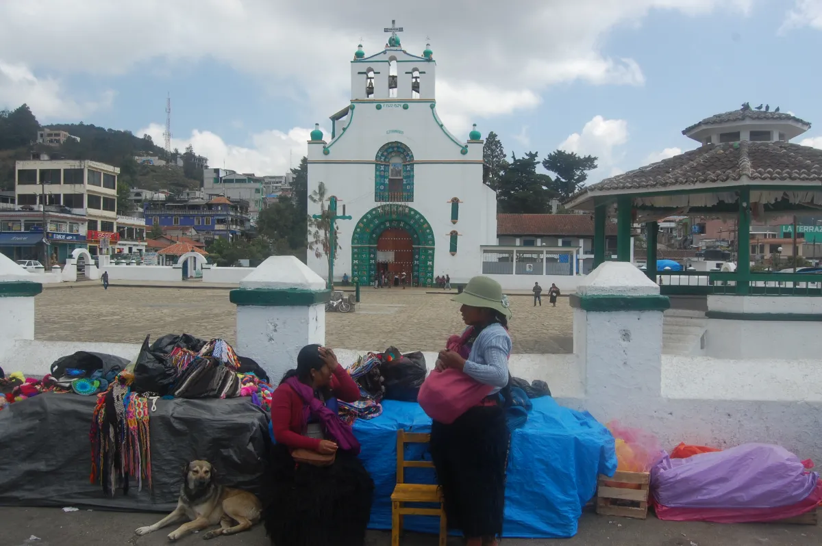 San Juan Chamula, un villaggio maya a poco meno di un’ora dalla città, dove non si parla spagnolo ma la lingua tzotzil, e dove le donne vestono gonne di lana di pecora nera e le case sono fatte di fango, noto per il suo variopinto mercato e per l’antica chiesa parrocchiale di San Juan, al cui interno ogni giorno si celebra un rito assai singolare: lo spazio è gremito di gente, il popolo di San Juan Chamula, uomini, donne e molti bambini seduti o sdraiati sul pavimento cosparso di aghi di pino. L’aria si riempie d’incenso mentre sull’altare i ritratti dei santi troneggiano come icone assolute. Ve ne sono altre lungo la navata dove si concentra la preghiera dei fedeli: gli uomini bevono mezcal, le donne pepsi cola per scacciare gli spiriti maligni mediante la digestione immediata, nel mentre una vecchia con accanto un bambino, stringe il collo di una gallina prima del sacrificio. Non è difficile cogliere in questo rito che può durare l’intera giornata e che è rigorosamente proibito fotografare, una sorta di sincretismo religioso che mescola la liturgia cattolica con talune antiche credenze maya, suscitando un forte effetto di sovrabbondanza, quasi che la fede abbia bisogno dell’eccesso per arrivare meglio a Dio.