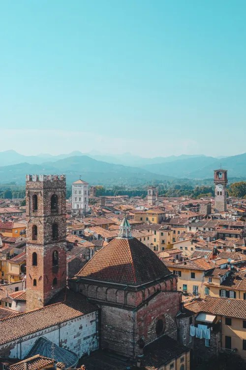 Lucca è città medievale appartata, gelosa ancora oggi della propria indipendenza storicamente mantenuta, come repubblica, principato, ducato, fin quasi all’unità d’Italia. Il centro medievale intatto, su cui svetta la torre coronata di lecci dei Guinigi, è protetto da possenti mura rinascimentali, mai utilizzate a scopo difensivo, quasi simbolo del grande riserbo dei lucchesi. Tu vedi lunge gli uliveti grigi | che vaporano il viso ai poggi, o Serchio, | e la città dall'arborato cerchio, | ove dorme la donna del Guinigi. A raddoppiare oltre le mura le difese, cinge Lucca insieme al suo contado una cerchia di colline olivate che si fanno rapidamente montagne: i monti Pisani, gli Appennini, le Alpi Apuane.