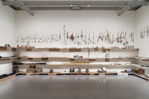 Ed ecco un’altra tematica fondante il lavoro dell’artista italo-francese: l’objet trouvé, di duchampiana memoria, raccolto e conservato, quale portatore di tracce del tempo e narratore di possibili storie. Storie che si intrecciano con la cronaca, con il suo mondo interiore, con la sua biografia. Si veda, ad esempio, la sua prima mostra nel 1995, realizzata a Villa Arson a Nizza, dove ha compiuti i suoi studi. Benché nata a Cosenza nel 1968, dopo diverse peregrinazioni, è approdata a Parigi, avvertita come il vero punto di partenza della sua attività. Infatti, la collettiva del 2001, “Ecco il mondo nella testa”, al Museé d’Art Moderne de la Ville de Paris a Parigi, curata da Susanne Pagè, la considera come il vero inizio del suo percorso. Perché ogni lavoro intreccia sempre il suo quotidiano col collettivo. Linea presente anche in quei lavori che, apparentemente, sono i più “distaccati” e “avulsi”, come la serie Notes on Sculpture (2025), che combina oggetti diversi nella quale ogni opera prende il nome da un momento particolare e da una persona allora presente nei pensieri di Trouvé all'epoca della realizzazione della scultura. Un intreccio che coinvolge anche l’interno e l’esterno, ottimamente rappresentato da Storia notturna, 30 giugno 2023 e Navigation Gates (2024), entrambe della serie Sitting Sculpture. Una coppia di cancelli in bronzo, realizzata con i calchi di radici e rami, ad evocare sia i rifugi temporanei dei nomadi nel deserto, che le carte nautiche a bastoncini delle Isole Marshall, per indicare le antiche tecniche di orientamento basate sulla memoria, si apre verso l’attigua sala dove troneggia una grande installazione, realizzata con calchi in gesso di quanto Trouvé ha raccolto (resti di cassonetti, plastiche bruciate, vetrine rotte: un ambiente in cui l’essere umano ha agito, del quale si ha la sensazione della sua presenza, la stessa che si avverte in molte opere di Mike Nelson) nelle strade di Montreuil all’indomani dei disordini scoppiati in seguito all’uccisione a bruciapelo, da parte di un agente di polizia, di un ragazzo di appena diciassette anni, di origine nordafricana. Materiali notevolmente ingranditi per dar vita a un immaginario paesaggio attestante la rabbia di coloro a cui sono sottratti dei diritti.