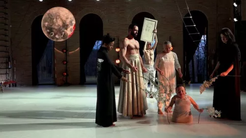 Il Pinocchio del Teatro Valdoca con la regia di Cesare Ronconi è Silvia Calderoni, attrice che in scena si muove, corre, si agita, brucia, traducendo in avventure fisiche le storie del burattino di Collodi. Il pezzo di legno c’è, in mezzo alla platea svuotata delle sedie del teatro Bonci di Cesena, dove ENIGMA. Requiem per Pinocchio, con i testi poetici di Mariangela Gualtieri, debutta in prima assoluta venerdì 14 e sabato 15 maggio. In realtà non è un pupazzo: Pinocchio, su una portantina-barella nel parterre, è un mucchio di tronchetti e rami di potatura di viti e olivi che culminano in una testa sbozzata. Accanto alla protagonista, la Fata è Chiara Bersani, con il danzatore Matteo Ramponi come Mangiafoco, con il canto di Silvia Curreli e Elena Griggio e gli interventi musicali dal vivo di Attila Faravelli, Ilaria Lemmo, Enrico Malatesta.