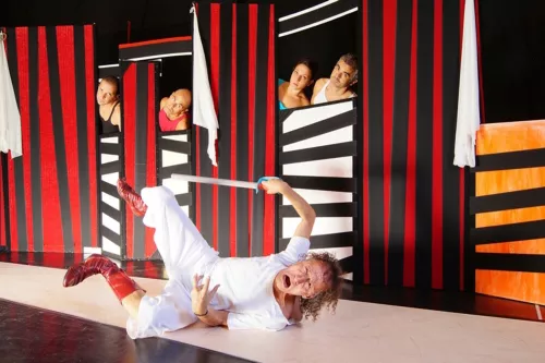 Questo spettacolo è sempre corso fino al soffocamento, da questa marionetta insidiata dalla presunta esattezza scientifica di un mondo approssimativo, che con la sua purezza geometrica certificata dai grandi scienziati, Pitagora, Keplero, Copernico, Newton, in leggi matematiche inoppugnabili, in vertiginose radici quadrate, inocula sempre e soltanto sofferenza, nevrosi, instabilità. Rezza – volto contratto, voce deformata in maschera di infantile ingenua perfidia – dirige le danze ora scrivendo inutili formule matematiche sulla grande lavagna del pavimento attraversato, come le edicolette, da interferenze coloristiche simili a faglie, a fratture di terremoti, a crepacci dell’anima. Le sue controfigure si scompongono in gambe, braccia, volti, natiche, ritmici incalzanti salti sulle sedie, a simulare un altro unico corpo allungato, dilatato, moltiplicato, suppliziato. Sade domina questa scena del sacrificio sull’altare della banalità quotidiana, sempre colorato con tono di anarchico sberleffo. In uno sproloquiare senza requie, come sempre negli spettacoli di questo contorsionista della parola ospitato da morbide colorate leggere strutture architettoniche di Flavia Mastrella simili ad abbracci aperti sul vuoto, i veri protagonisti si rivelano il linguaggio e le sue malattie, le sue ipertrofie narcisistiche che cercano di coprire gli sprofondi di solitudini troppo fragorose, troppo devastanti, e l’insensatezza dell’agire.