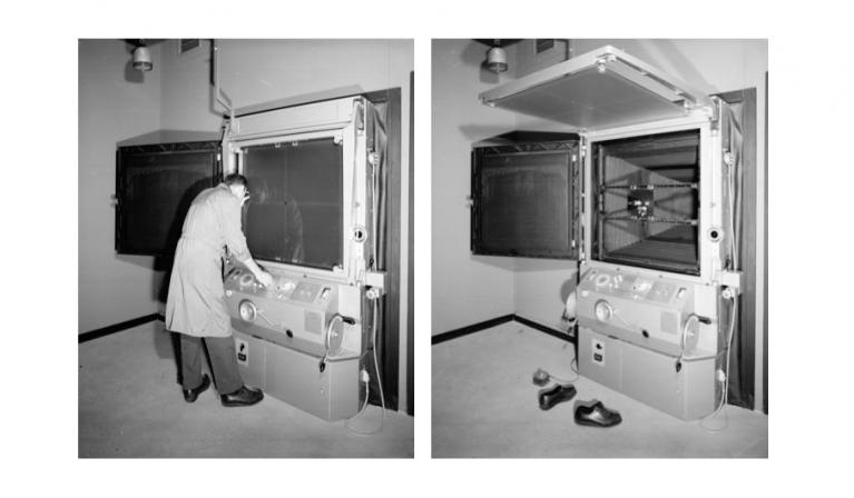 Emerge così un senso di straniamento portato dal medium dello humour, che indaga le idee astratte e le domande della scienza attraverso quelle “piccole storie assurde” che hanno preso vita dalle sue manipolazioni sulle fotografie dell’archivio, mostrando i limiti della conoscenza umana. Fathi lavora sulla reinvenzione della realtà, agisce entro uno spazio di confine tra l’empirismo e la metafisica, tra oggettività e incontrollabilità, tra la ricerca rigorosa della scienza e le emozioni, tra l’esplorazione e la conoscenza, tra la sfera privata e quella sociale, in uno stato tra la vita umana e ciò che potrebbe essere altrove.