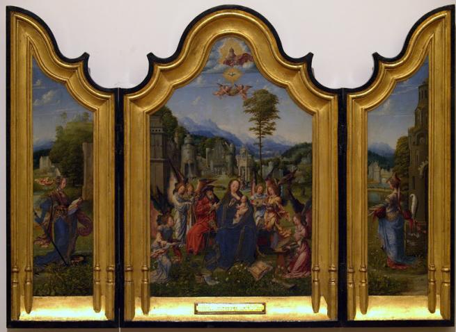 Dall'incanto del suo collo torno poi alla prima damigella, alla delicatezza con cui volta la pagina e regge il manoscritto tra le mani. È solo allora che noto il panno: panno che poi ritroverò nelle due sorelle di questa coppia che occupano i pannelli laterali di un “Trittico con sacra famiglia” di un ignoto Maestro olandese realizzato nel 1520-30 circa. Le sante sono Barbara e, vedi le coincidenze, di nuovo Caterina, qui non ancora a nozze. Ciascuna nel suo bel pannello personalizzato, le due sante sono raffigurate in piedi: in quello di S. Caterina si nota come il panno sia unito, forse da piccole cuciture, alla massiccia copertina, penso di cuoio - ma allora non andavano per il sottile e le copertine le facevano anche di legno, spesso con rinforzi di metallo, e pietre incastonate, e tutto un repertorio di superfetazioni variabili quasi a ribadire che non si tratta di un tascabile e che anche il trasporto è sconsigliato: eppure vedi la leggerezza con cui queste donne all'apparenza così gracili, con quella testolina che sbuca appena da quei copricapo così voluminosi oltre che preziosi, li sorreggono! Dico all'apparenza, perché già affrontare il martirio non è affare da ochette svenevoli, ma queste due, oltre che elegantissime e con un repertorio di veli svolazzanti, gemme e froufrou che di sicuro incanterebbero un Arbasino (o avranno incantato, perché cos'è che non ha visto quel sant'uomo?) e altri amanti della passamaneria e dell'estetica esuberante, sono rappresentate anche con un che di aggressivo, e direi quasi di minaccioso (un ultraedipico come il sottoscritto direbbe quasi castratrici): Caterina con la ruota ai piedi e uno spadone in mano che impugna con nonchalance e senza sforzo, manco fosse un leggerissimo bastone da passeggio (appunto: spadone, lei...); e Barbara (che protegge dalle morti violente, ed è patrona, tra l'altro, della Marina militare italiana, dei Vigili del fuoco, dei genieri e di altre categorie a rischio come gli architetti, i montanari, gli stradini, i cantonieri, i campanari e, qualunque cosa possa significare, gli artisti sommersi, quorum ego quindi), con, al posto della prosaica palma dei martiri, una grande piuma vaporosa di qualche uccello esotico, magari proprio di un uccello del Paradiso, o di altre località del turismo oltremondano, che sembra che il librone lo abbia scritto lei in persona (e intenda continuare, perdipiù), entrambe circondate da un cospicuo numero di erbe e piantine dipinte con una tale acribia che solo la simbologia, mica il naturalismo, può giustificare, e con alle spalle, invece, paesaggi agresti che verso il fondo sfumano nel favoloso, di un azzurro che di leonardesco ha solo una vaga memoria, e per il resto, come lo sfondo del pannello centrale, sono solo protodisneyani, cosa che a qualcuno magari parrà un merito.
