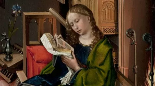 dettaglio di Santa Caterina e Maria Maddalena (1440 ca.) di Konrad Witz, al Musée des Beaux-Arts di Strasburgo.