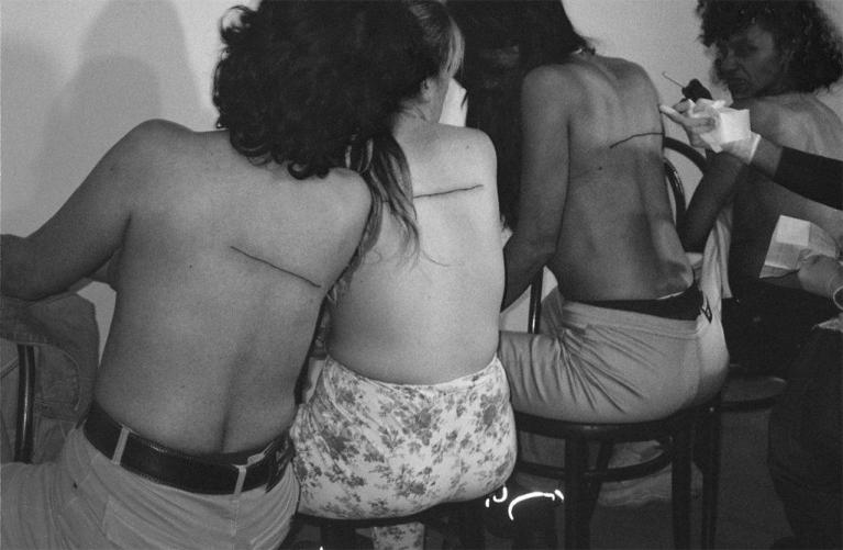 Santiago Serra, Immagini tratte dalla performance all'Havana, Riga di 250 cm tatuata su sei persone retribuite, 1999.