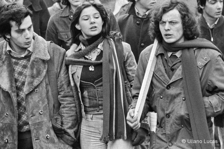 L’ondata repressiva non è fatta solo di arresti e perquisizioni, significa obbligare a distinguere tra compagni buoni e, per usare un eufemismo allora in auge, compagni che sbagliano, significa clima di sospetto, di delazione, tradimenti, paura. Centri di documentazione, librerie, punti di aggregazione, chiudono per le intimidazioni; i gruppi si frantumano. Il fumo dei lacrimogeni e quello della canapa lentamente cala, come il prezzo dell’eroina che si appresta a sferrare il colpo di grazia. I compagni che distribuiscono volantini non ci sono più, sono spariti anche quelli che scattano foto dentro e ai margini del corteo per mandarli ai loro giornali. Ma Uliano Lucas è ancora al suo posto, a documentare la cacciata da un Paradiso solo appena intravisto negli occhi di tre ragazzi che corrono, con le loro bandiere rosse, verso un sole dell’Avvenire che sappiamo tramontato.