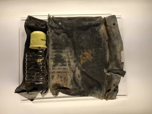 In copertina, La bottiglia e la borsa in cui era contenuta la lettera di Marcel Nadjari datata 3 novembre 1944, allo stato del dissotterramento del 1980. © Museo Statale di Auschwitz-Birkenau.