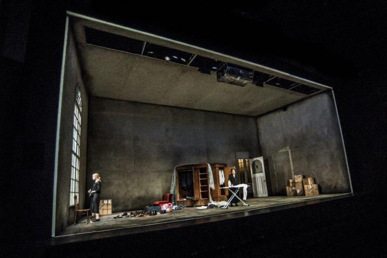 Nel primo atto Schuster è narrato, nei dati essenziali della sua biografia, dalla governante Frau Zittel in dialogo con la cameriera Herta mentre preparano gli ultimi bagagli nella stireria, tra alte porte e ante altissime di armadi, aperte e chiuse. Le didascalie in questa pièce, come raramente nell’opera teatrale di Bernhard, sono estremamente precise, per indurre a una ricostruzione puntuale di quell’ambiente peculiare. La vecchia servitrice delinea la personalità puntigliosa del professore rievocando le sue maniacali istruzioni per stirare le camicie. In un clima claustrofobico le due donne, devote all’estinto, osservano anche il vestito indossato il giorno della morte appena segnato dal volo nel vuoto e dal rovinoso impatto con la piazza. Saltano da un argomento all’altro, mentre chiacchiere e notizie ci offrono una prima rappresentazione “laterale”, “dal basso” del professore, dei suoi viaggi, delle voci che ossessionano la moglie, del ricovero allo Steinhof della donna, dei preparativi per la partenza, di vicende familiari... Sembra di essere in una surreale commedia di conversazione, addirittura forse in un’operetta viennese, sulla quale incombe qualcosa di sinistro.