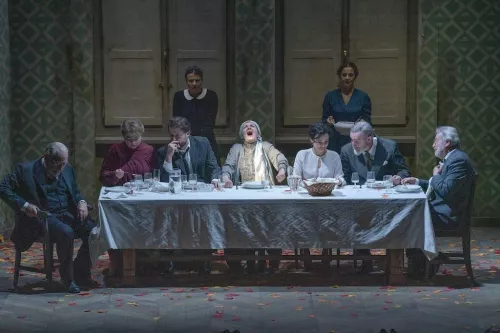 Gli alberi sospesi, che troneggiavano metaforici in aria con i loro fusti troncati nel secondo atto, ritornano fuori dalle finestre nel terzo e ultimo. Pranzo, in una casa ormai vuota. Arrivano a poco a poco altri personaggi, la commedia si avvia verso la conversazione, e ancora di teatro, e della sua inattualità, delle sue menzogne si parla (doppio, o triplo era l’atteggiamento di Bernhard nei confronti della scena: sempre in dubbio sulla verità, sulla realtà, e sulle possibilità di conoscerle e dirle).