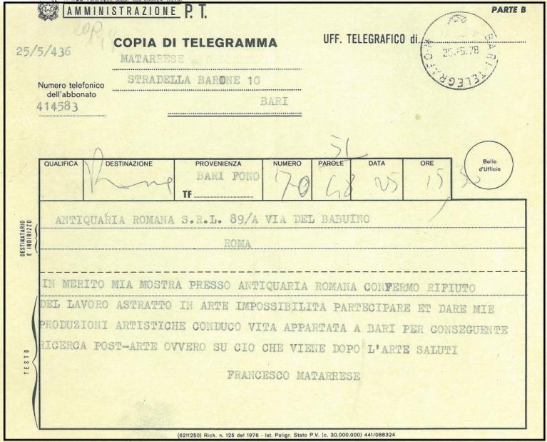 Francesco Matarrese, Telegramma di rifiuto del lavoro astratto in arte,  1978.