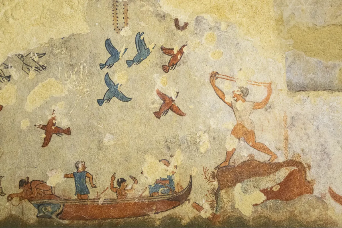 Tarquinia con le sue torri, simili ad antenne, gli appare di colpo all’orizzonte. È l’aprile del 1927 e D.H. Lawrence è partito da Roma insieme all’amico Earl Brewster dopo aver visitato il museo di Villa Giulia. Il suo scopo è visitare i luoghi etruschi. La città laziale è stata la capitale della lega che univa le città di questo popolo. Morta come le altre dopo la conquista romana, è risorta nel Medioevo con altro nome: Corneto. Lo scrittore sa che lì c’è un importante museo e un’ampia serie di tombe dipinte scoperte nel corso dei secoli precedenti. Non è attratto dall’arte, piuttosto dalla rivelazione di qualcosa che sta cercando in Italia. Per trovarlo s’immerge nel mondo sotterraneo degli Etruschi. Lawrence assolda una guida che l’accompagna con una lampada. Entra nella Tomba della Caccia e della Pesca. I muri sono danneggiati, parti si sono staccate e l’umidità ha corroso i colori, eppure nell’oscurità avverte “voli d’uccelli che fuggono tra le tenebre con un fremito di vita nelle ali”; la camera è “affrescata tutt’intorno con cielo nebbioso e mare (…) e piccoli uomini che cacciano, pescano e vogano in battelli”.